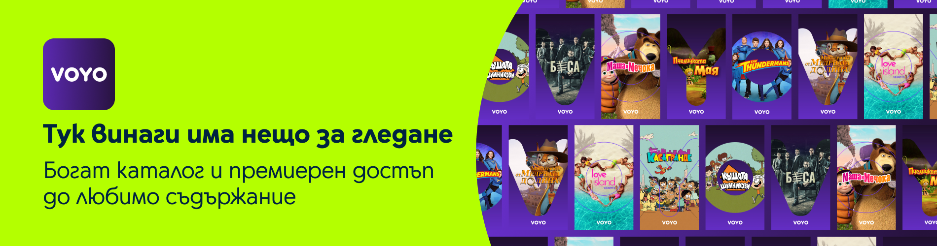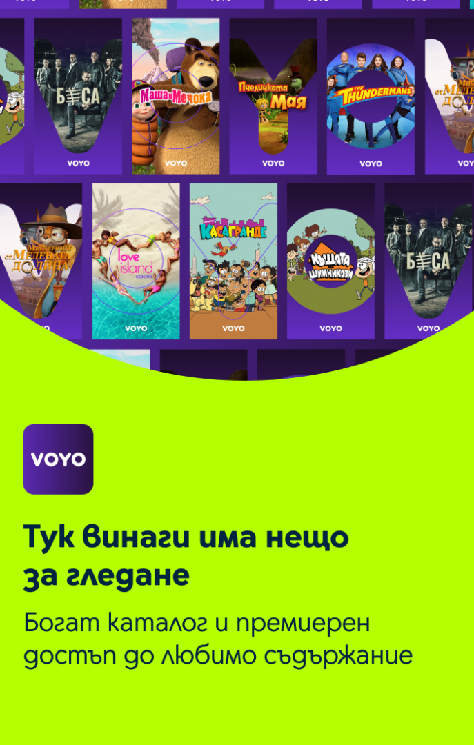 VOYO.BG е онлайн видео платформа, където можеш да откриеш каталог с различно видеосъдържание, включително филми, сериали, предавания, детски програми и спорт, достъпни по всяко време, с неограничено гледане без реклами и с професионални субтитри или дублаж.