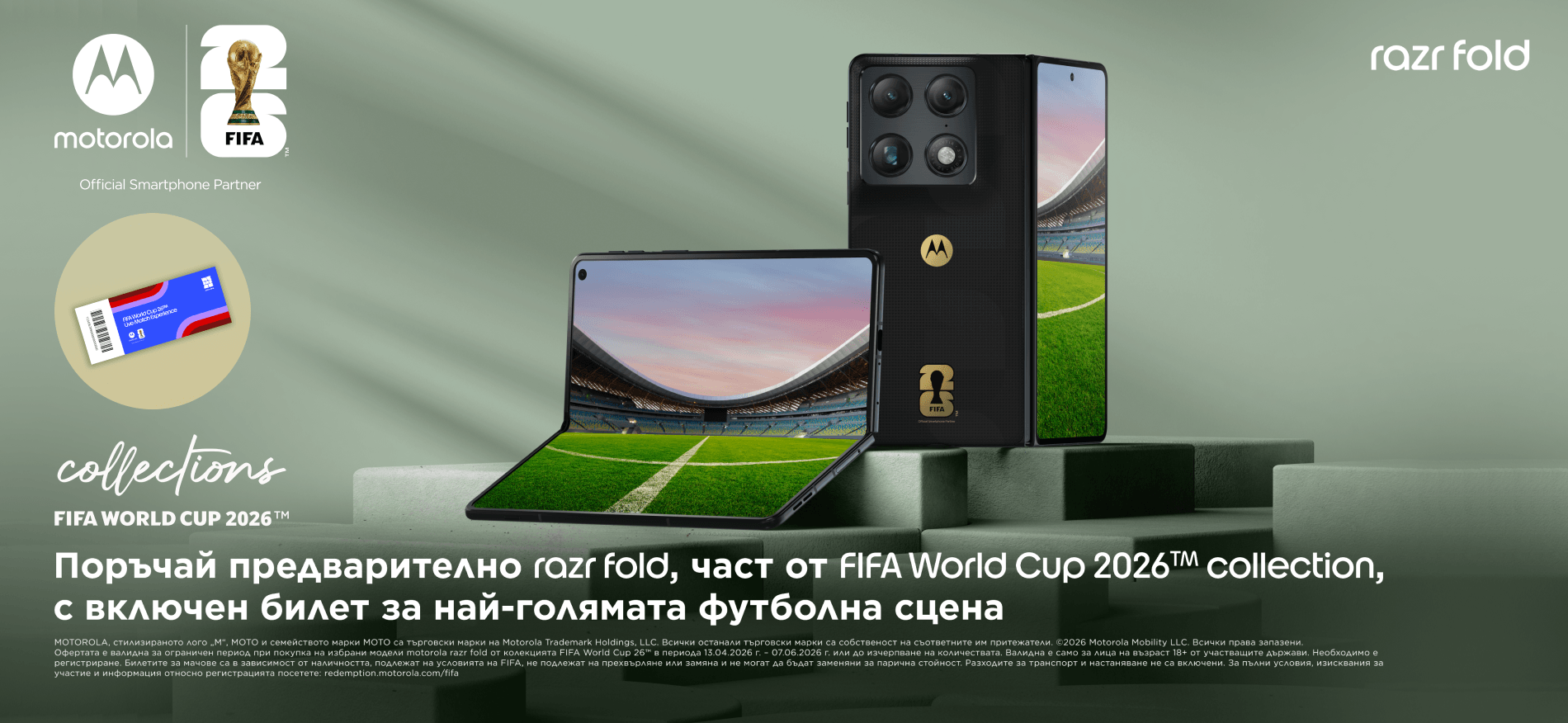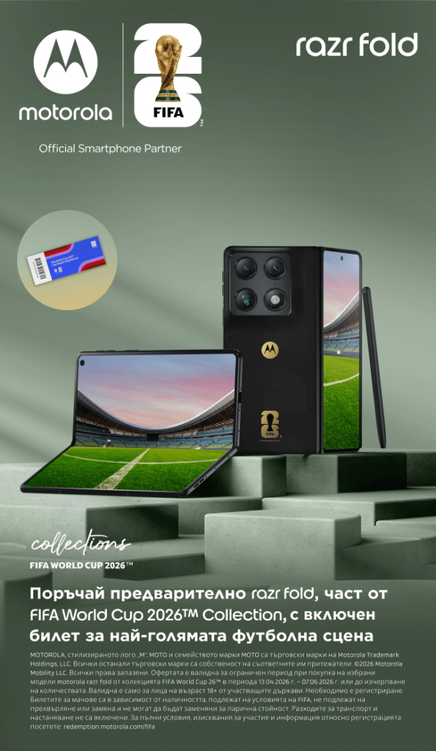 Вземи предварително новия смартфон Motorola Razr Fold 5G FIFA Edition и получи с него билет за един от най-желаните футболни мачове за спортното събитие на годината - Световното първенство по футбол 2026 г. в САЩ, Мексико и Канада. Посети мачовете за страните, олицетвоярващи играта - Бразилия и Англия, и стани част от момент, който ще остане в историята. Побързай и купи предварително смартфона с билет сега, за да планираш пътуването спокойно.