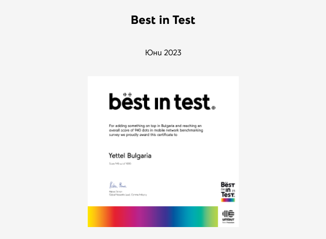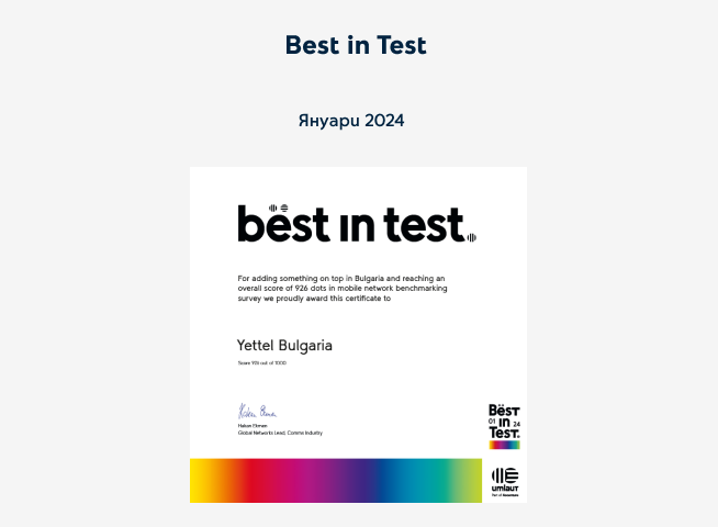Мрежата на Yettel България е отличенa за четвърти пореден път със сертификат Best in Test на база 76 милиона проби от потреблението на ползвателите на мобилните мрежи в България, в три категории. Поредното постижение отново е измерено от немската независима компания umlaut. Сертификатът се присъжда за достигането на 904 от 1000 възможни точки. Това е най-добрата обща оценка от трите мобилни оператора в България.