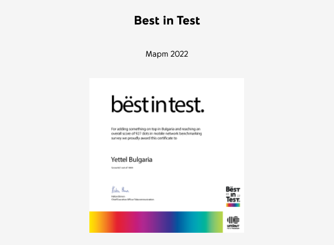 Мрежата на Yettel България е отличенa за пети пореден път със сертификат Best in Test на база 76 милиона проби от потреблението на ползвателите на мобилните мрежи в България, в три категории. Поредното постижение отново е измерено от немската независима компания umlaut. Сертификатът се присъжда за достигането на 904 от 1000 възможни точки. Това е най-добрата обща оценка от трите мобилни оператора в България.