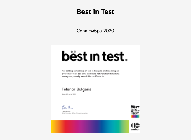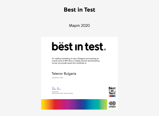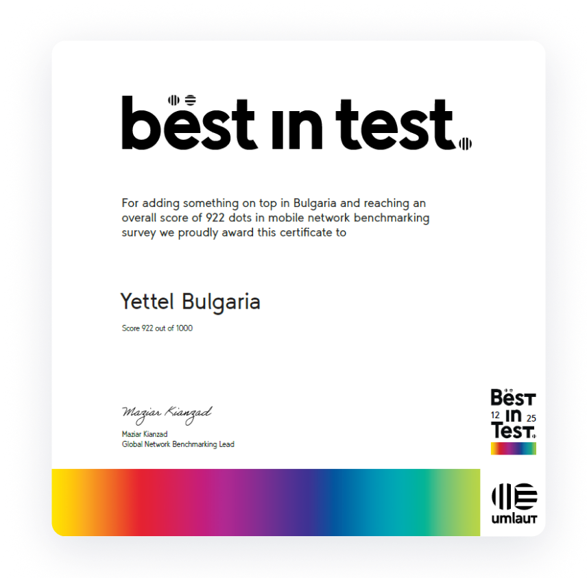 Сертификат Best in Test 03/20 Мрежата на Yettel България е отличенa за втори пореден път със сертификат Best in test на база 53.1 милиона проби от потреблението на ползвателите на мобилните мрежи в България, в три категории. Високото постижение отново е измерено от немската независима компания umlaut. Сертификатът се присъжда на Yettel за достигането на 859 от 1000 възможни точки. Това е най-добрата обща оценка от трите оператора в България.