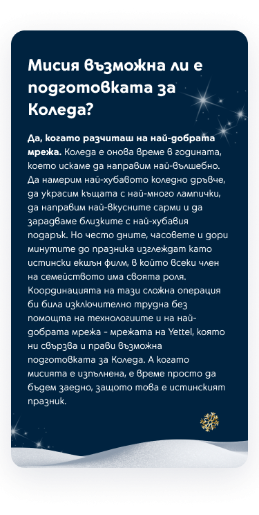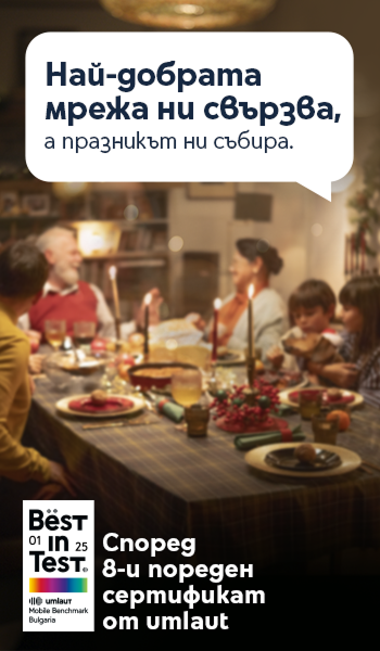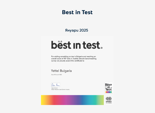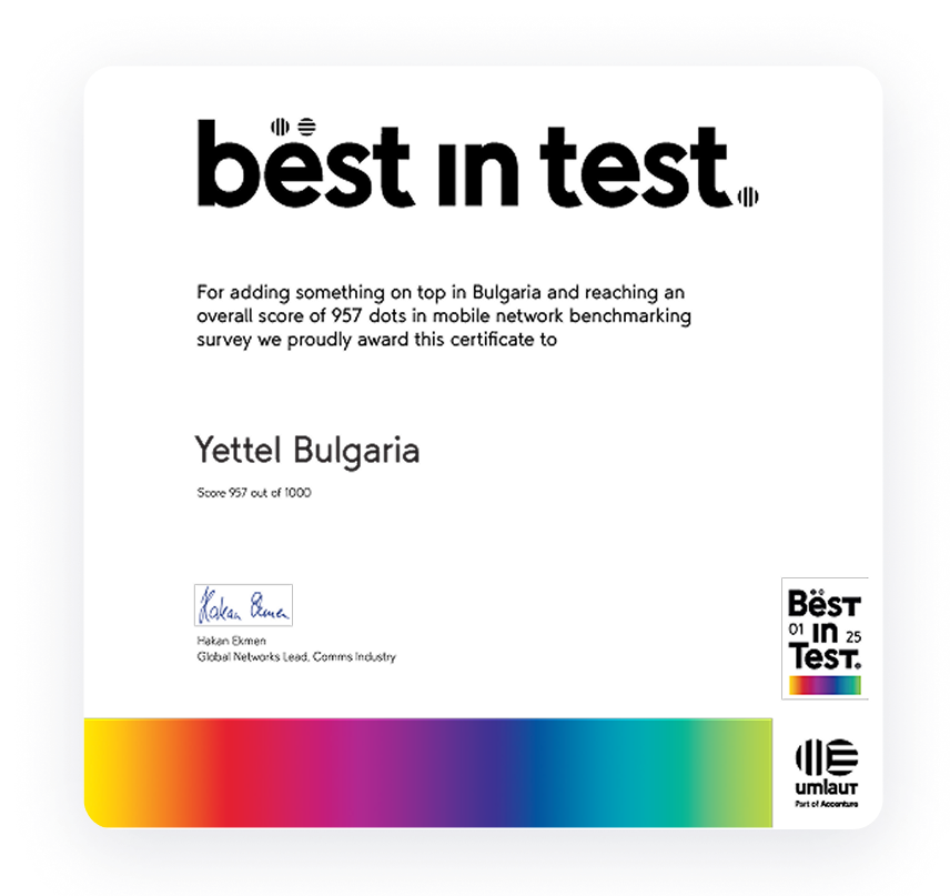 Според сертификата Best in Test 01/25 мрежата на Yettel предоставя най-доброто цялостно клиентско изживяване в България, отчитайки скорост, надеждност, покритие и времезакъснение. Тази 360-градусова оценка ни поставя в топ 10 на мобилните оператори в Европа, както и в топ 20 на най-добрите в света.