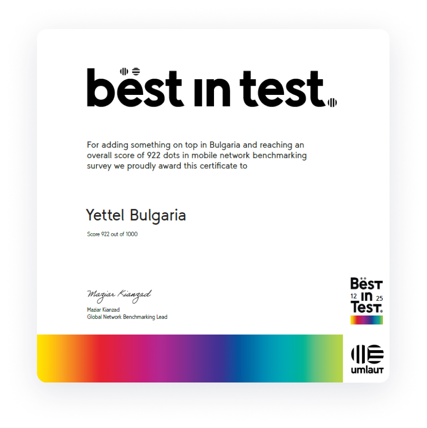 Според сертификата Best in Test 12/25 мрежата на Yettel предоставя най-доброто цялостно клиентско изживяване в България, отчитайки скорост, надеждност, покритие и времезакъснение. Изследването е проведено от немската независима компания umlaut.
