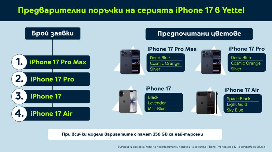 Yettel отчита над 10% ръст в предварителните поръчки на новите модели от серията iPhone 17 спрямо миналогодишните iPhone 16 устройства. По общ брой заявени устройства води iPhone 17 Pro Max линията, но най-поръчваният модел смартфон в мрежата на Yettel е iPhone 17 Pro 256 GB Deep Blue. За сравнение, миналогодишният фаворит на клиентите на телекома е бил iPhone 16 Pro 256 GB Black Titanium.