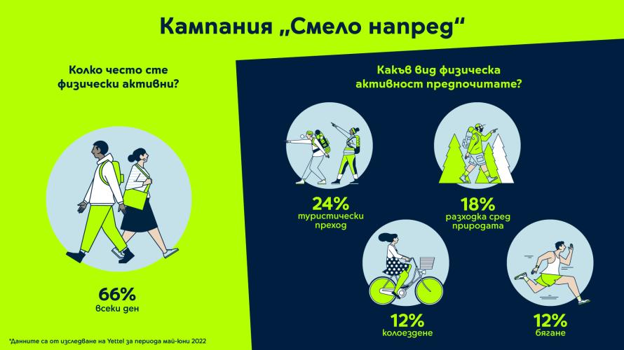 Офертата важи до 31 юли с всички абонаментни планове Тотал+ и Тийн В рамките на проучване, проведено от Yettel, става ясно, че 66% от българите всеки ден практикуват някакъв спорт или се занимават с активности на открито. Ето защо, като част от стартиралата наскоро кампания на оператора - „Смело напред“, Yettel предлага на всички свои клиенти 6 месеца неограничен интернет на територията на страната за всички абонаментни планове „Тотал +“ и „Тийн“, при сключване на нов договор. Клиентът, подписал нов договор, може да активира пакета с неограничени мегабайти през банер, който автоматично излиза в секция „За теб“ в приложението Yettel, за да получи своя промоционален мобилен интернет за следващите шест месеца. Той става активен веднага след получаване на потвърждаващ SMS. Благодарение на мобилния интернет, клиентите на телекома ще могат да останат свързани, независимо дали са на туристически преходи (каквито правят 24% от анкетираните в проучването на Yettel), разходки сред природата (18%) или при занимания с любимия си спорт – като колоездене (12%) и бягане (12%), според резултатите от проучването. Така технологиите ще им помогнат да намерят необходимия баланс между работа и почивка, благодарение и на доброто 4G и 5G покритие на Yettel, даващо възможност за използване на интернет и на най-отдалечените места у нас. Проучването показва, че хората, ангажирани със занимания на открито, правят това средно 168 дни в годината, дори и да пътуват в чужбина. В рамките на 6-месечния период е включен и роуминг интернет за ЕС в рамките на 2200 МВ допълнително, от който те ще могат да се възползват. Кампания „Смело напред“ си поставя за цел да мотивира клиентите на оператора да спортуват на открито и да се движат повече, като предоставя възможност за още интересни оферти през юли и август. Безпроблемната връзка с интернет, докато са в движение, може да позволи на потребителите не само да споделят прогреса си от спортното занимание и красивите гледки от природата в социалните мрежи, но и да използват множество приложения и уеб базирани решения, които подобряват изживяването по време на активен спорт и туризъм, използване на карти за ориентация и различни тракери за безопасност в планината. Не на последно място, благодарение на неограничения мобилен интернет, всеки активен и прекарващ времето си на открито човек може спокойно да използва различни музикални стрийм услуги, така че да слуша любимите си парчета, които да го мотивират допълнително, докато спортува или се отдава на туризъм. Повече информация за атрактивните предложения на Yettel за активен начин на живот можете да намерите тук.