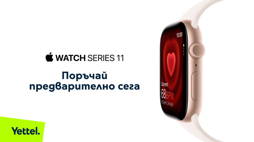 Apple Watch Series 11 идва с функция за оценка на съня (sleep score), до 24 часа живот на батерията и дисплей, който е два пъти по-устойчив на надраскване. Моделът се предлага с алуминиев корпус в новия цвят Space Gray, както и в Jet Black, Rose Gold и Silver, а също и с полиран титаниев корпус в цветове Natural, Gold и Slate. Цената му в Yettel започва от 869,99 лв./ 444,82 евро в брой или 38,99 лв./ 19.94 евро на месец за 2 години.