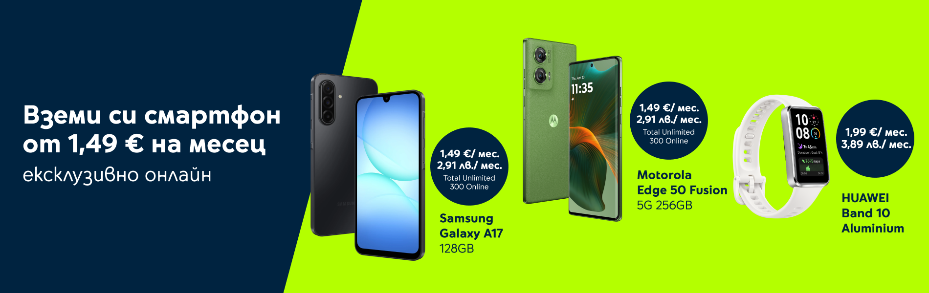 Офертите за до 70,00 евро / 136,91 лв. отстъпка от Samsung Galaxy A17 128GB и MOTOROLA Edge 50 Fusion 5G 256GB 2025 са валидни само в онлайн магазина на Yettel от 07.01.2026 г. до 01.02.2026 г. или до изчерпване на количествата, за частни клиенти, при покупка на устройството в брой или на лизинг за 24 месеца и едновременно сключване на 24-месечен договор за мобилни услуги за абонаментни планове Total Unlimited.