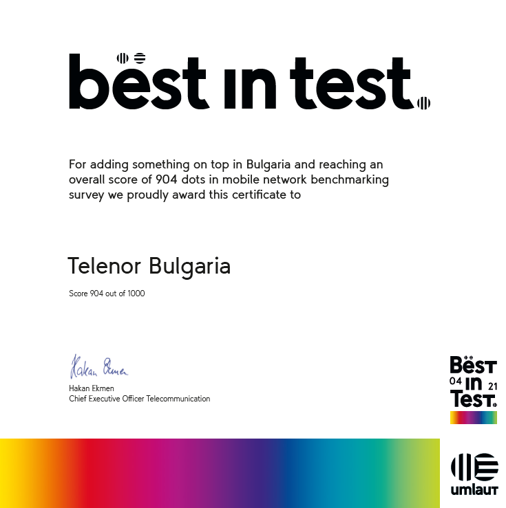 Сертификат Best in Test 03/20 Мрежата на Yettel България е отличенa за втори пореден път със сертификат Best in test на база 53.1 милиона проби от потреблението на ползвателите на мобилните мрежи в България, в три категории. Високото постижение отново е измерено от немската независима компания umlaut. Сертификатът се присъжда на Yettel за достигането на 859 от 1000 възможни точки. Това е най-добрата обща оценка от трите оператора в България.