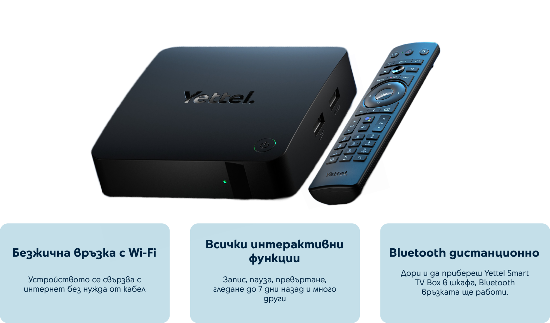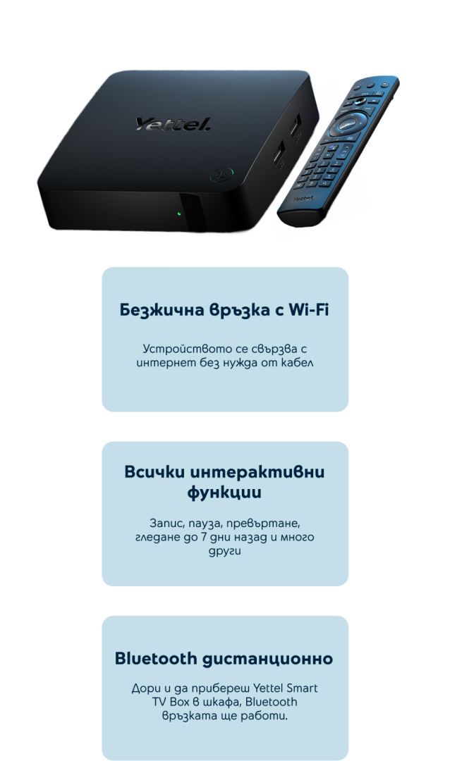 Yettel TV е достъпен на всички телевизори чрез Smart TV Box. С всеки план за ТВ и интернет получаваш един включен Smart TV Box, като ако добавяш екрани, можеш да добавиш и допълнителни Smart TV Box устройства. Ако имаш смарт телевизор*, можеш да инсталираш нашето Yettel TV приложение и да гледаш телевизия и без допълнително Smart TV Box устройство.