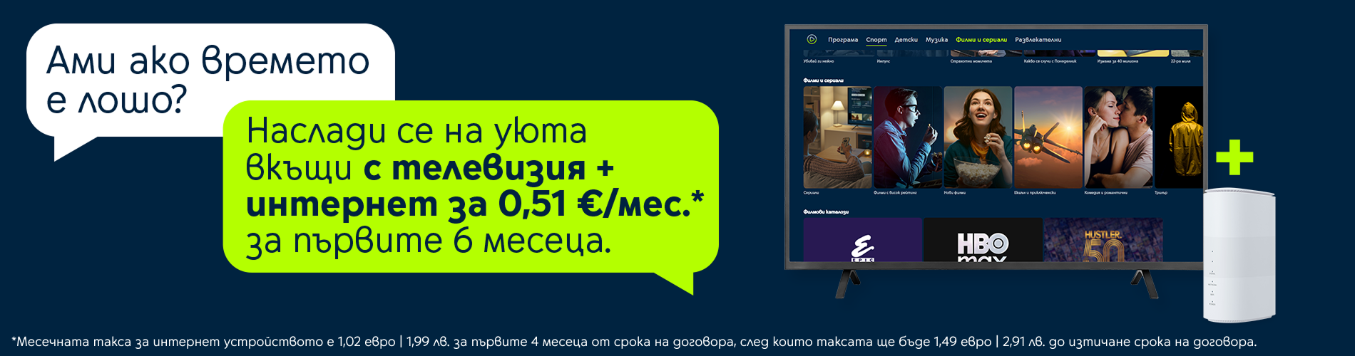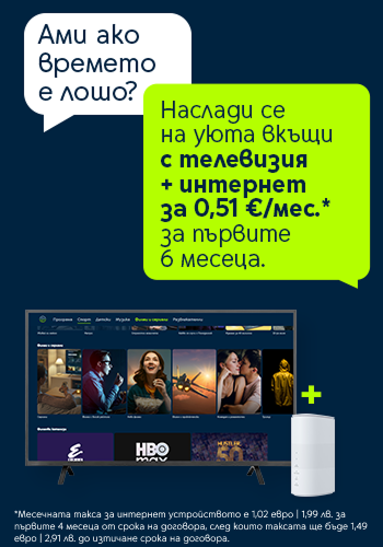 *Месечната такса за интернет устройството е 1,02 евро | 1,99 лв. за първите 4 месеца от срока на договора, след които таксата ще бъде 1,49 евро | 2,91 лв. до изтичане срока на договора.