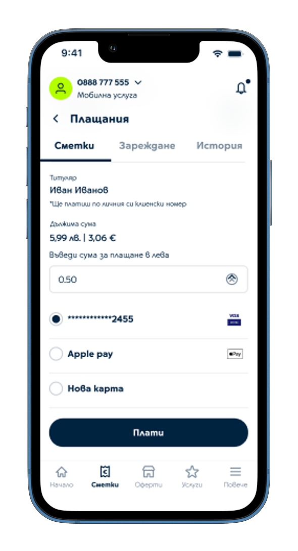 Плати фактура или да зареди кредит по предплатена карта за теб или близък/приятел изцяло в приложението. При това с метод по твой избор: