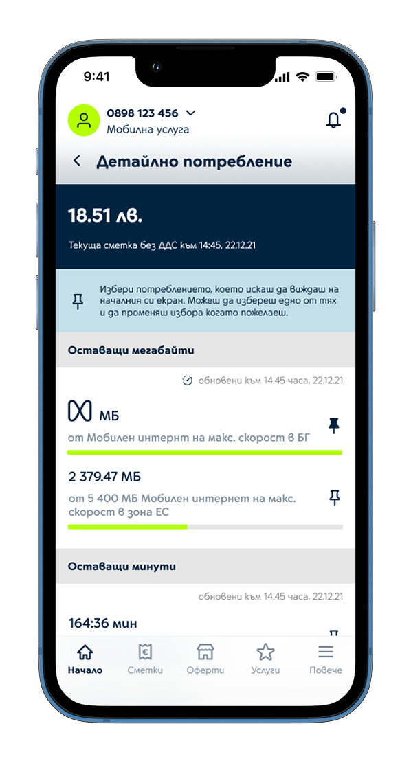 Следи сметката, текущото си потребление и оставащите минути и MB.