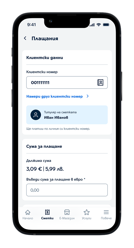 Плащай сметки - твои или на приятели/роднини, включително с Google Pay и Apple Pay.