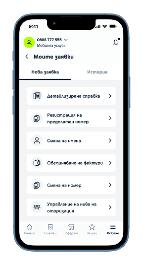 Подаването на заявка за промяна е функционалност, валидна за номер с ниво на оторизация Основен номер. Ще я откриеш в меню Повече -> Подай заявка, откъдето можеш да подадеш следните заявки: