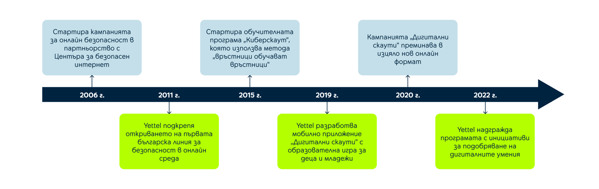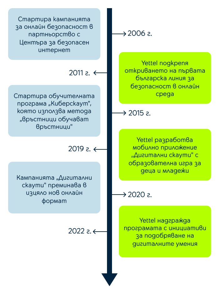 Програмата „Безопасен интернет и развитие на дигиталните умения“ е част от цялостната политика на Yettel за подпомагане на дигиталното приобщаване. В стратегията ни за устойчиво развитие си поставяме конкретни измерими цели в тази област. Научи повече за стратегията.