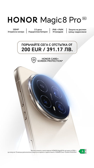 В периода от 15.01.2026 г. до 29.01.2026 , всеки клиент, който поръча HONOR Magic8 Pro 5G 512GB на yettel.bg ще може да го вземе на преференциална цена, която е с 200.00 EUR / 391.17 лв. с ДД. по-ниска от тази след официалното начало на продажбата на устройствата. Офертата е валидна при покупка на устройството в брой или на лизинг за 24 месеца и едновременно сключване на 24-месечен договор за мобилни услуги за абонаментни планове Total Unlimited. Прочети повече тук.