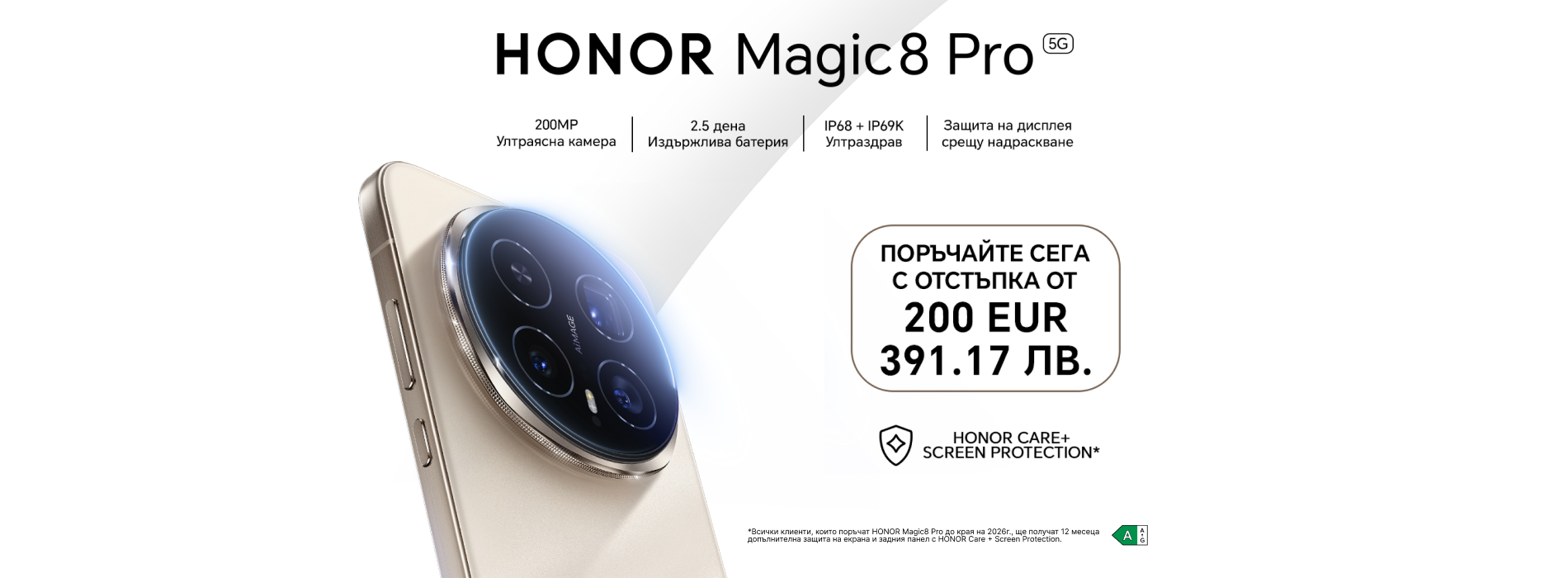 Новият телеофн от HONOR е тук - стилен, функционален, иновативен. Поръчай предварително до 29.01.2026 г. и го вземи с атрактивна отстъпка от 200 евро/ 391,17 лв. Kато бонус получаваш и 12-месечна услуга за защита на екран и гръб HONOR Care+. Можеш да се възползваш до края на кампанията или до изчерпване на количествата.
