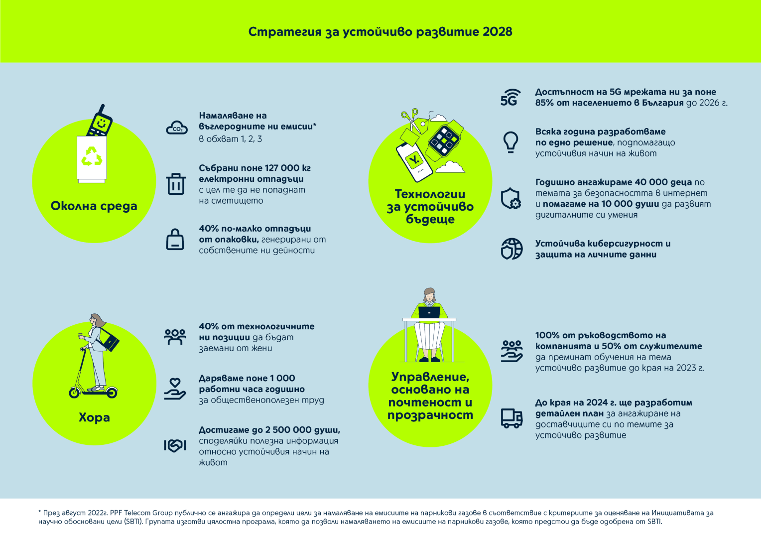 В Yettel вярваме, че технологиите не само правят ежедневието ни по-лесно, а ни помагат да променяме света. В центъра на нашата мисия е стремежът ни към баланс във всеки един аспект от живота. За целта въвеждаме устойчиви политики, мерки и цели, които следват нашата Стратегия за устойчиво развитие. Тя се фокусира върху четири ключови области.